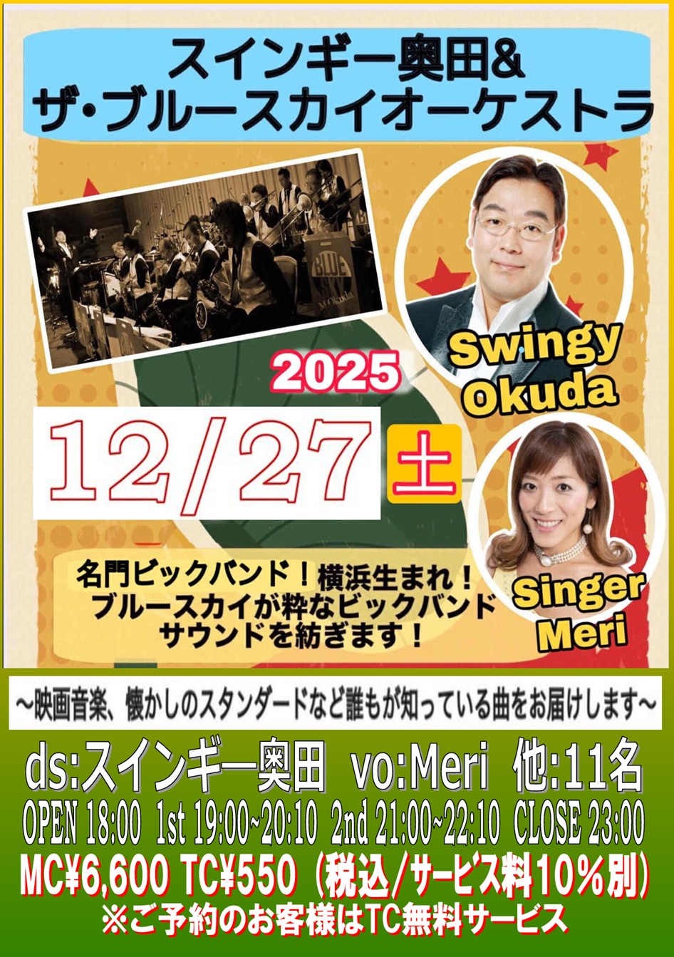 vo:Meri 他:11名 OPEN 18:00 1st 19:00~20:10 (入替なし) 2nd 21:00~22:10 CLOSE 23:00 ※MC 6,600円 (税込/サービス料10%別) |