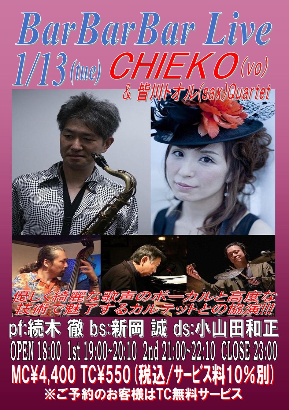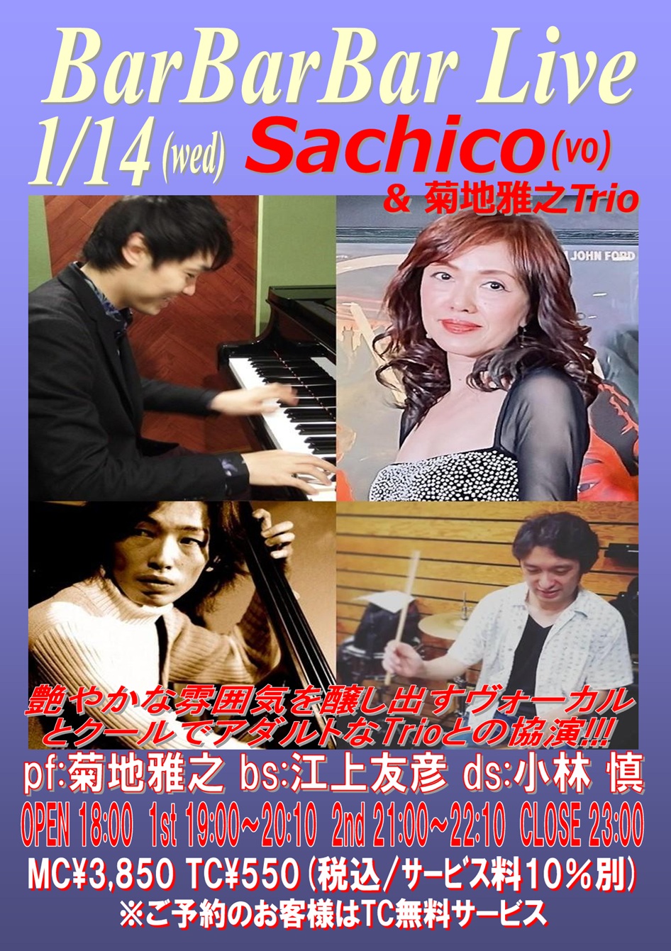 sax:皆川トオル pf:続木 徹 bs:新岡 誠 ds:小山田和正 OPEN 18:00 1st 19:00~20:10 (入替なし) 2nd 21:00~22:10 CLOSE 23:00 | 14 ♣Sachico & 菊地雅之Trio