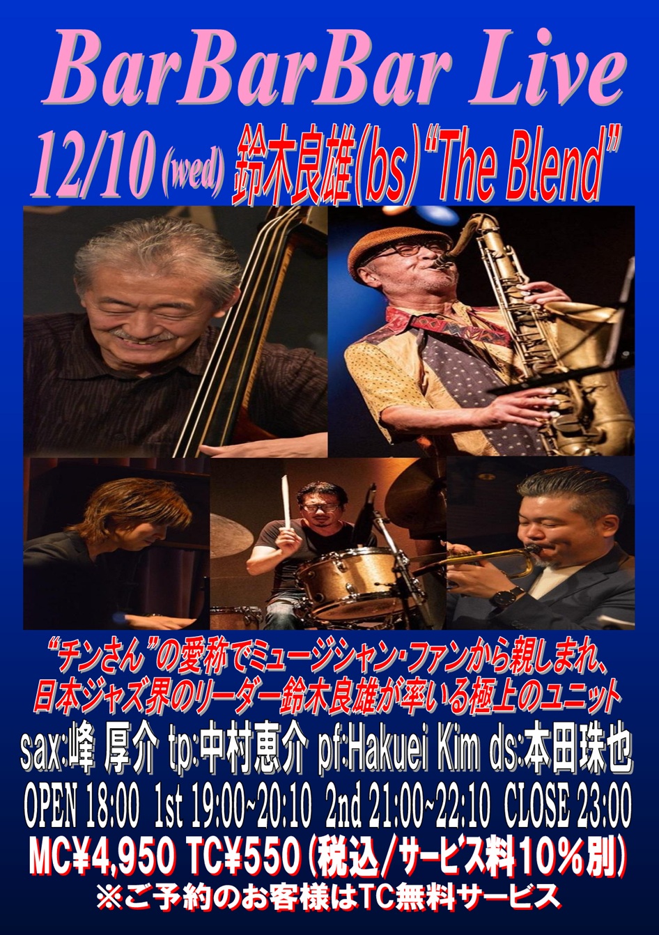 gt:足立壮一郎 bs:古田名沖 ds:永松瑛二 OPEN 18:00 1st 19:00~20:10 (入替なし) 2nd 21:00~22:10 CLOSE 23:00 | 10 ■鈴木良雄 "The Blend"