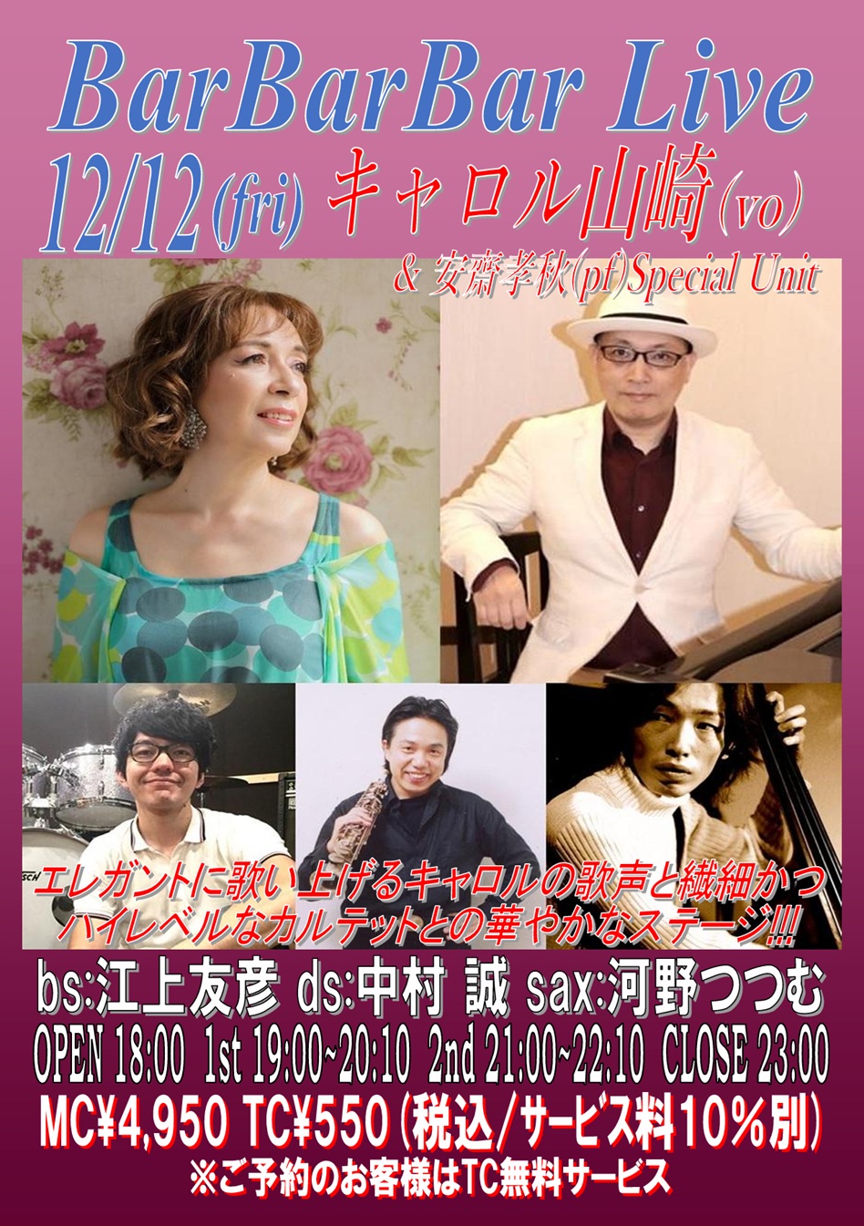 bs:鈴木良雄 pf:Hakuei Kim ds:村田憲一郎 OPEN 18:00 1st 19:00~20:10 (入替なし) 2nd 21:00~22:10 CLOSE 23:00 | 12 ■キャロル山崎 & 安齋孝秋 Special Unit