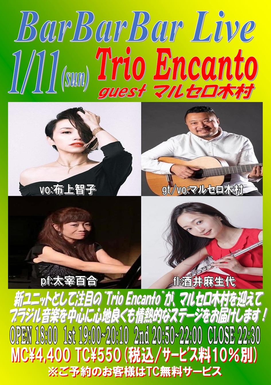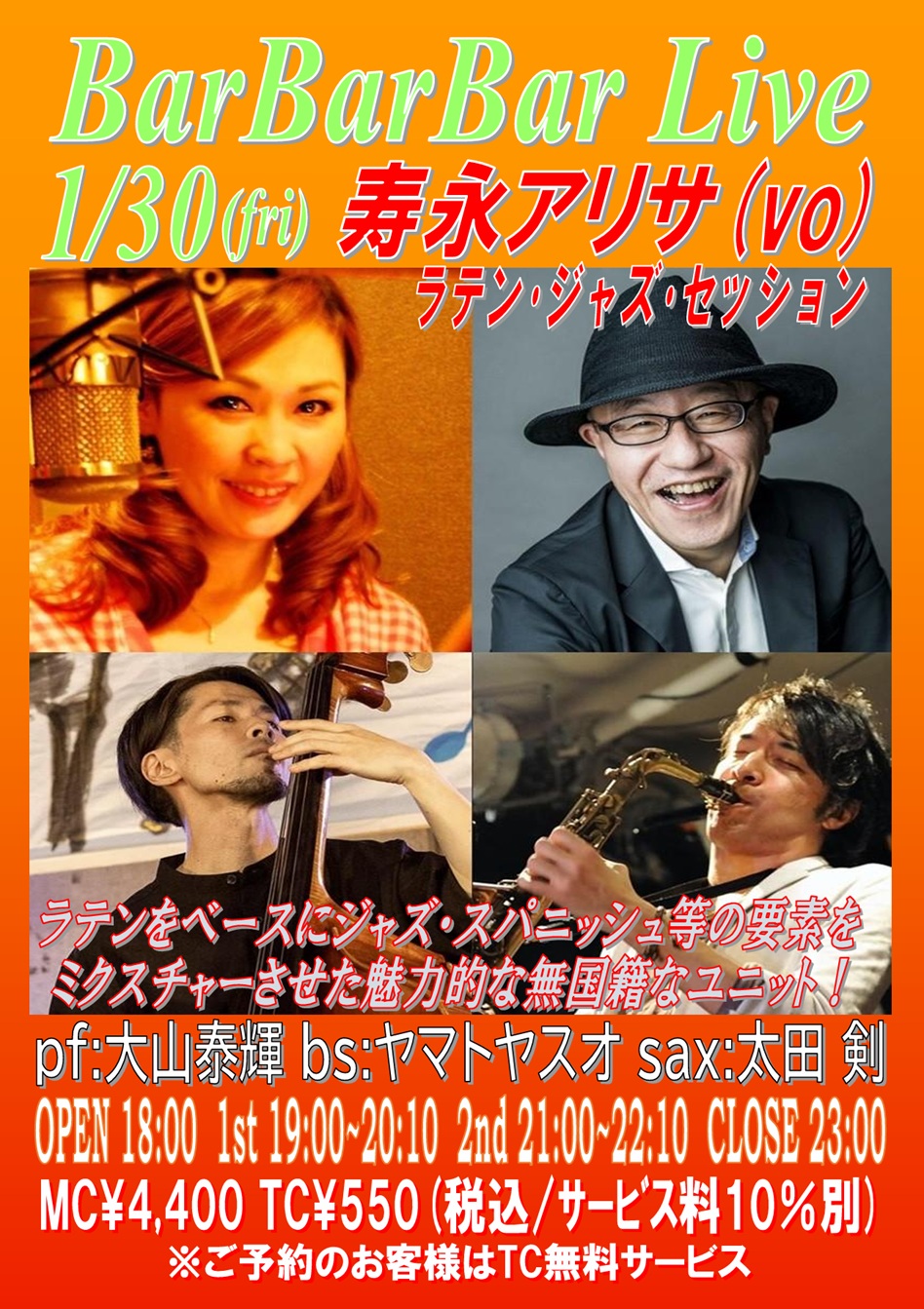 pf:青木弘武 bs:河原秀夫 ds:ジーン重村 OPEN 18:00 1st 19:00~20:10 (入替なし) 2nd 21:00~22:10 CLOSE 23:00 | 30 ●寿永アリサ"ラテンジャズセッション"
