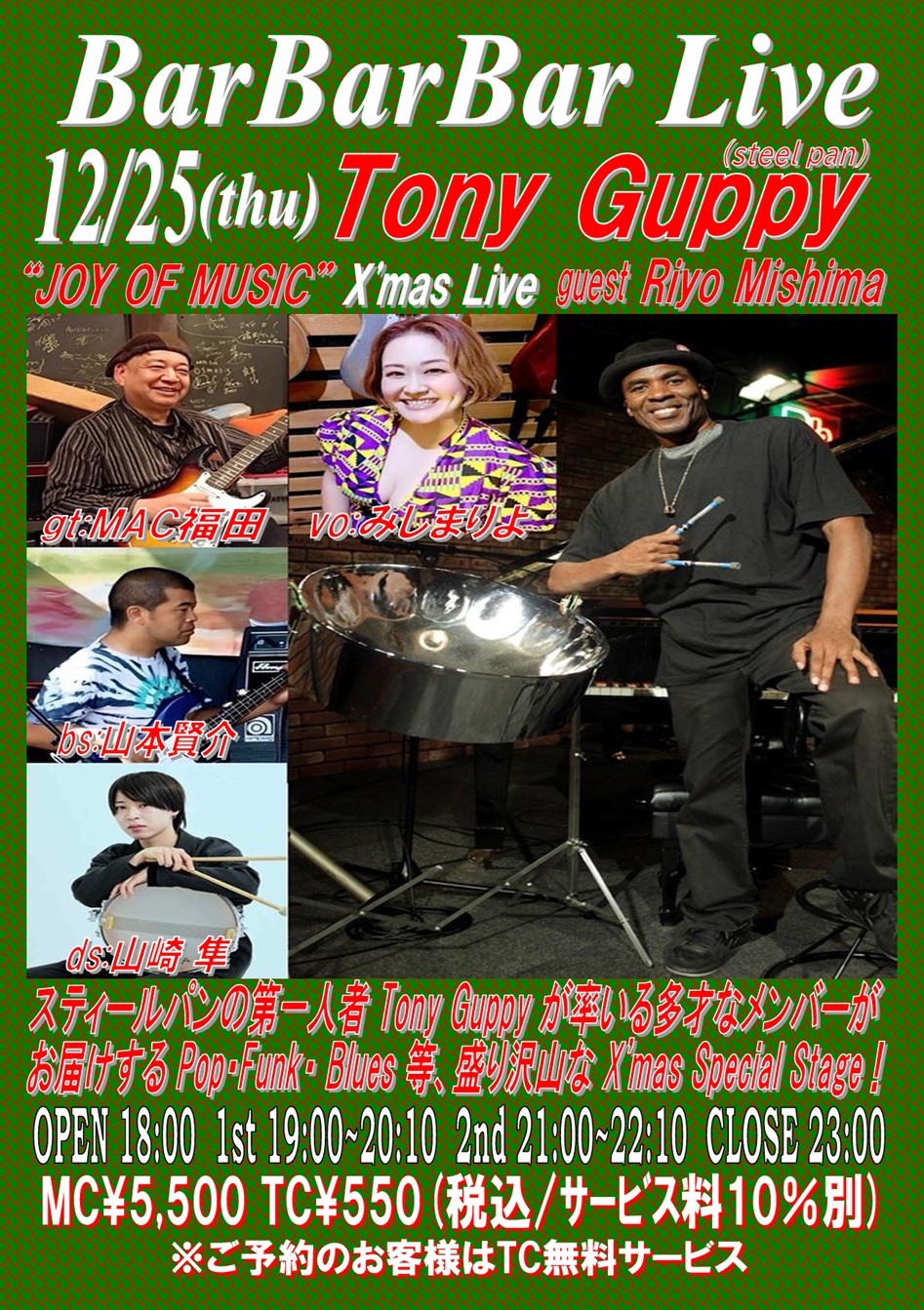gt:高木潤一 sax:太田 剣 pf:藤本暁子 bs:小泉哲夫 perc:藤橋万記 OPEN 18:00 1st 19:00~20:10 (入替なし) 2nd 21:00~22:10 CLOSE 23:00 ※MC 6,050円(税込/サービス料10%別) | 25 ★TONY GUPPY “JOY OF MUSIC” X'MAS LIVE