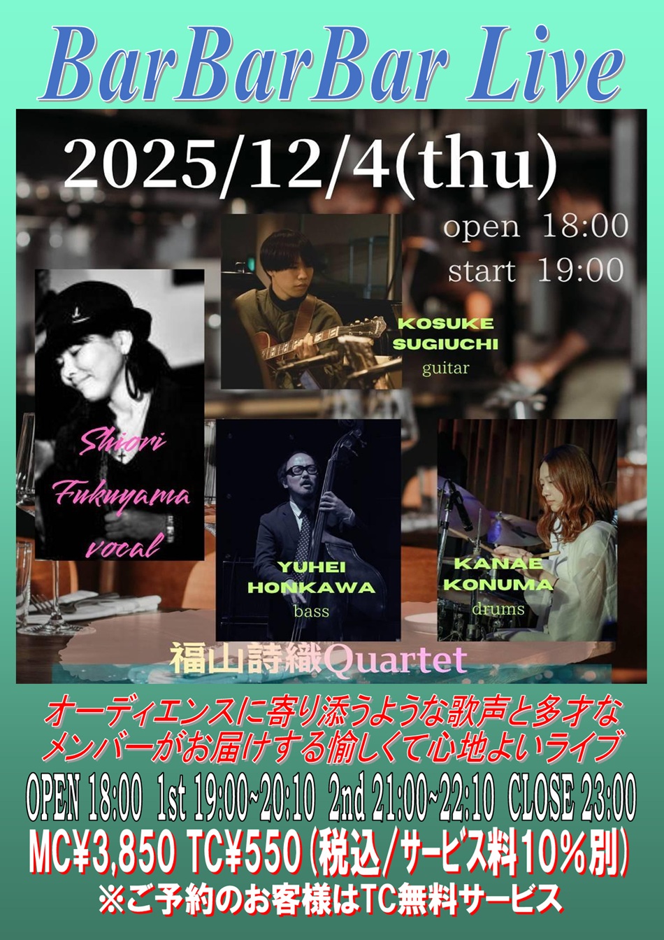 tb:池田雅明 sax:堤智恵子 pf:三木成能 bs:江上友彦 OPEN 18:00 1st 19:00~20:10 (入替なし) 2nd 21:00~22:10 CLOSE 23:00 | 4 ♣福山詩織Quartet