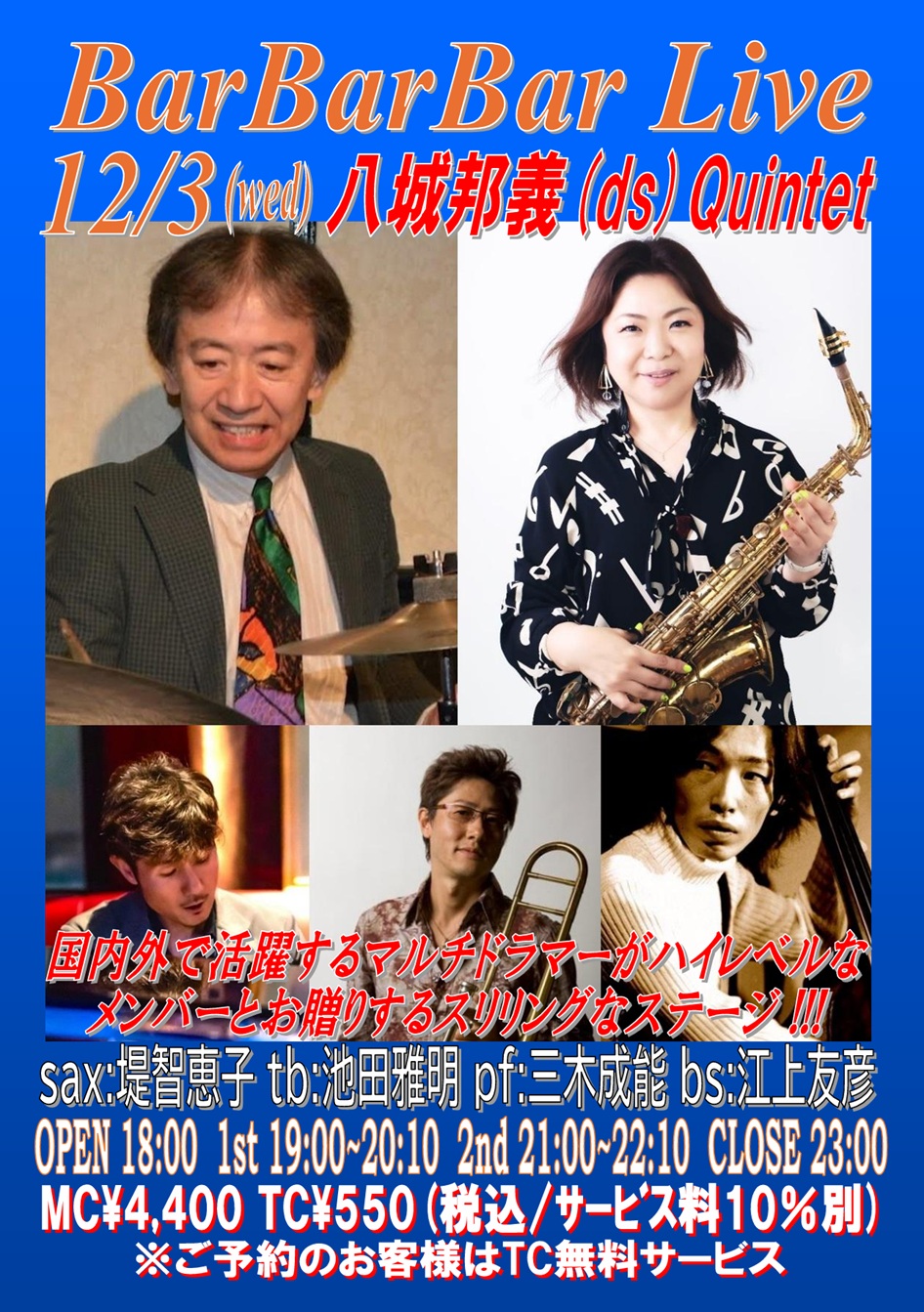 pf:進藤陽悟 bs:和佐田達彦 OPEN 18:00 1st 19:00~20:10 (入替なし) 2nd 21:00~22:10 CLOSE 23:00 | 3 ●八城邦義Quintet