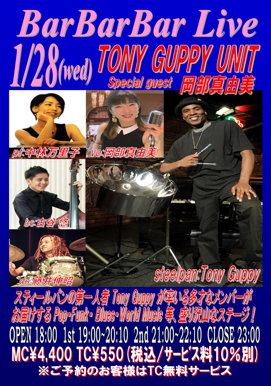 pf:岩崎壮平 bs:中村新太郎 ds:佐藤厚祐 OPEN 18:00 1st 19:00~20:10 (入替なし) 2nd 21:00~22:10 CLOSE 23:00 | 28 ●TONY GUPPY UNIT Special guest 岡部真由美