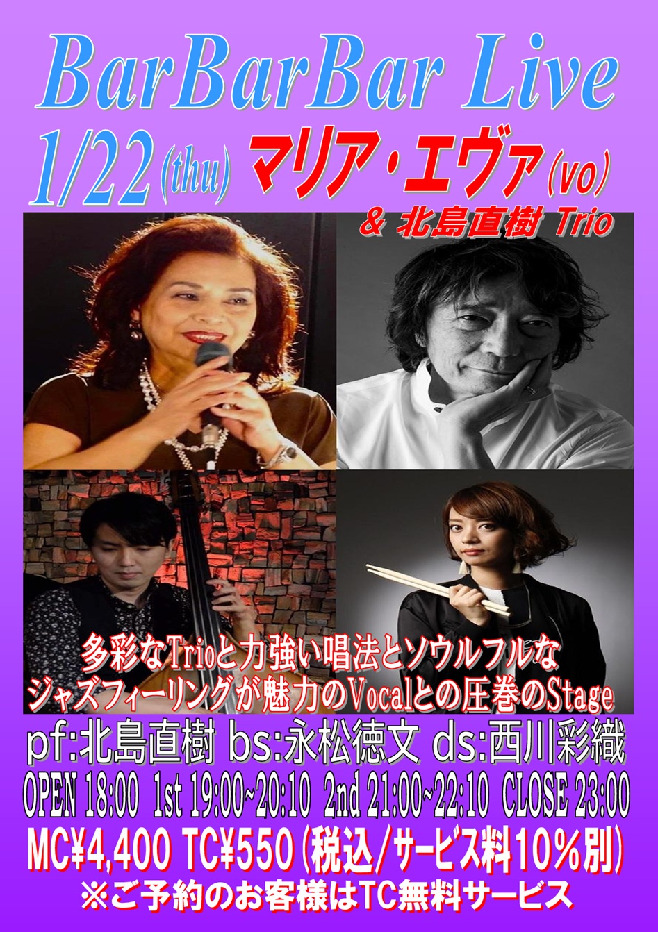 gt:小暮哲也 ds:杉山 寛 vo:清水秀子 OPEN 18:00 1st 19:00~20:10 (入替なし) 2nd 21:00~22:10 CLOSE 23:00 | 22 ●マリア・エヴァ&北島直樹Trio