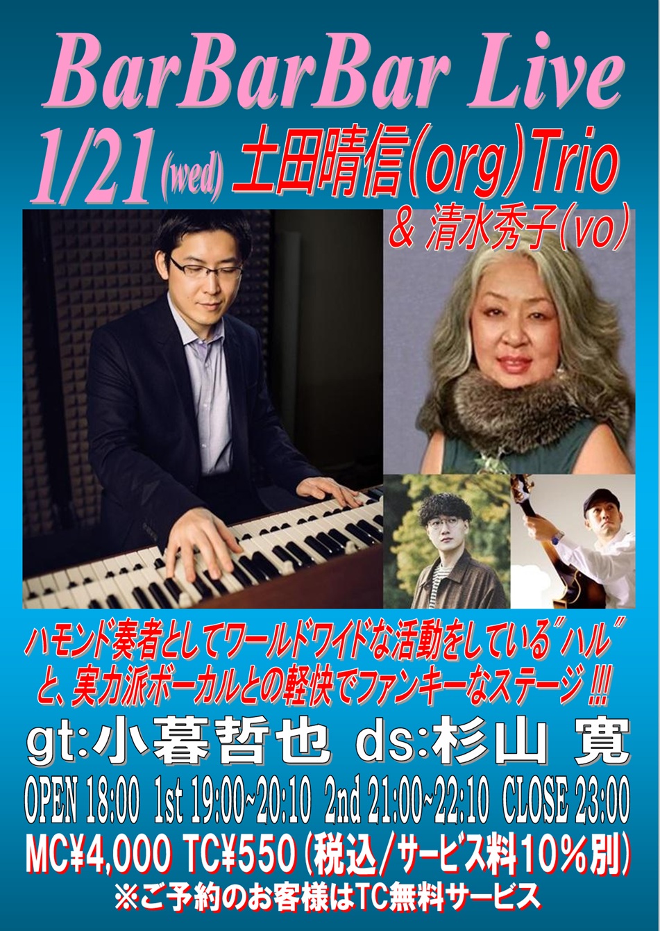 pf:小畑智史 bs:村谷ゆうすけ ds:チッコ相馬 OPEN 18:00 1st 19:00~20:10 (入替なし) 2nd 21:00~22:10 CLOSE 23:00 | 21 ●土田晴信Trio&清水秀子