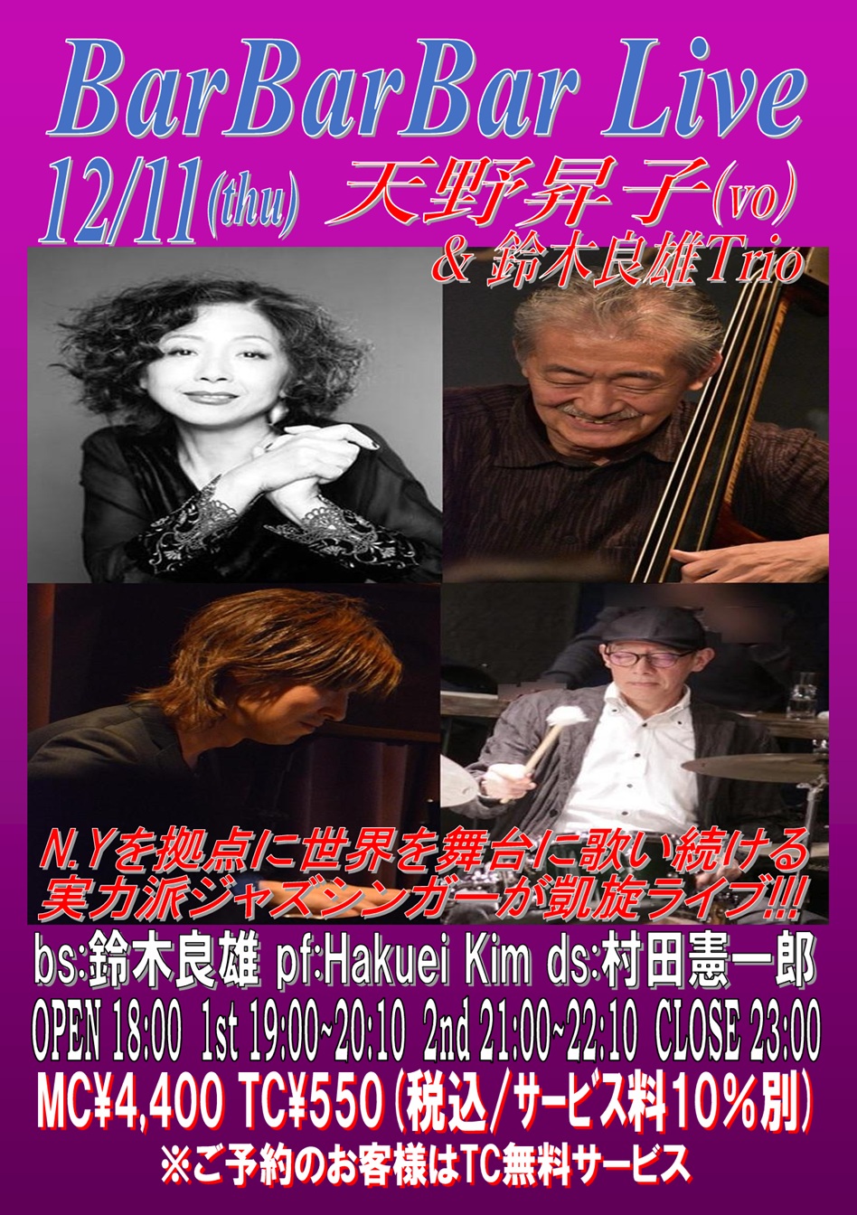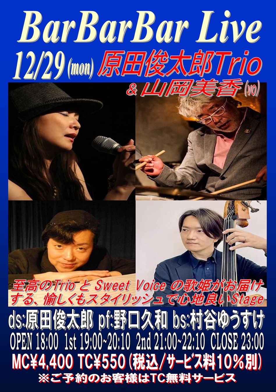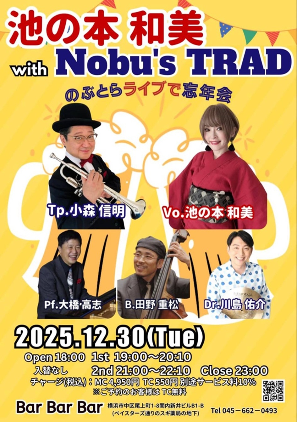 pf:野口久和 bs:村谷ゆうすけ vo:山岡美香 OPEN 18:00 1st 19:00~20:10 (入替なし) 2nd 21:00~22:10 CLOSE 23:00 | 30 ■Nobu's TRAD with 池の本和美