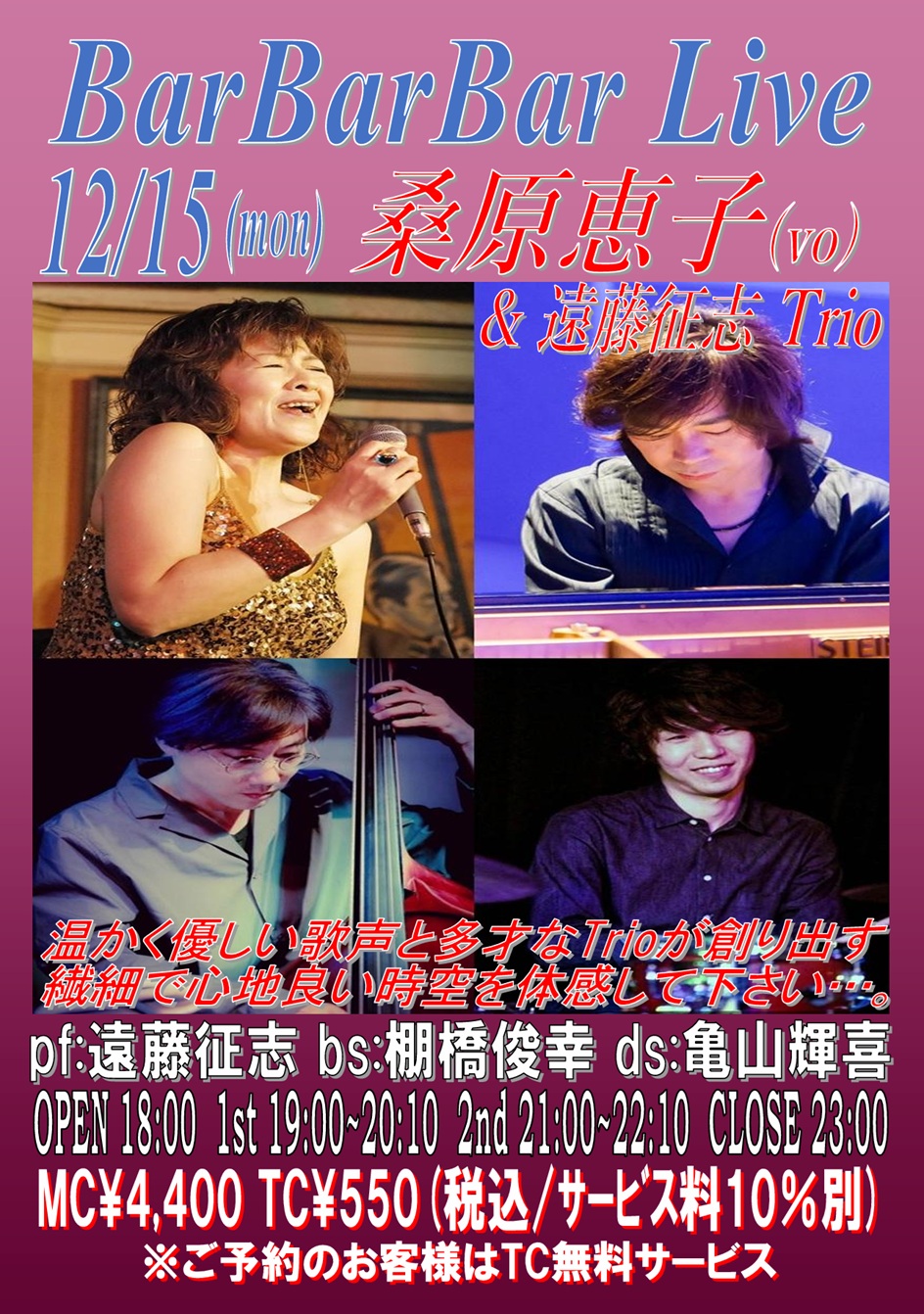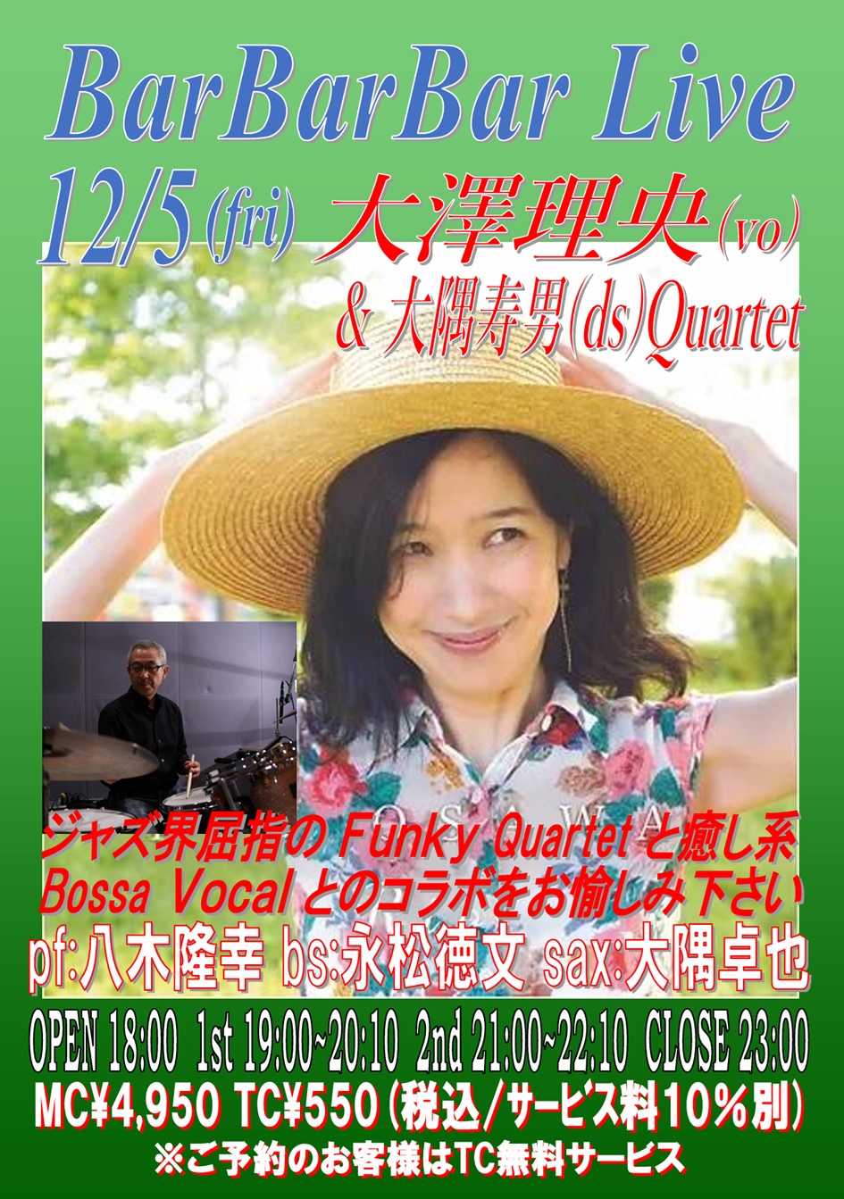 ds:松尾 明 pf:二村希一 bs:伊東佑季 sax:高橋康廣 OPEN 18:00 1st 19:00~20:10 (入替なし) 2nd 21:00~22:10 CLOSE 23:00 |