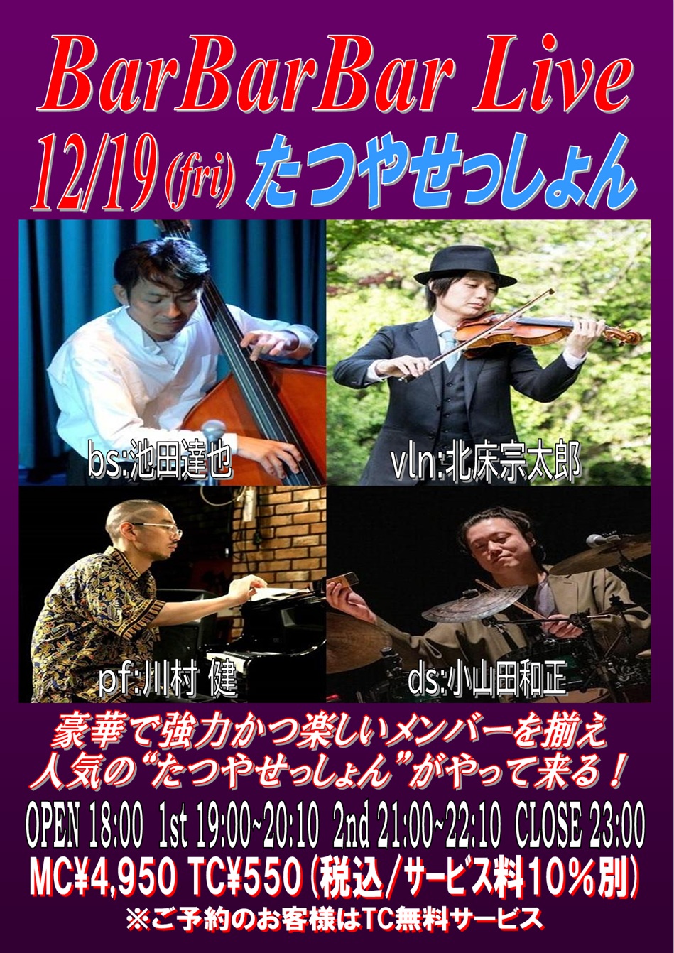 pf:青木弘武 bs:河原秀夫 ds:ジーン重村 OPEN 18:00 1st 19:00~20:10 (入替なし) 2nd 21:00~22:10 CLOSE 23:00 | 19 ■たつやせっしょん