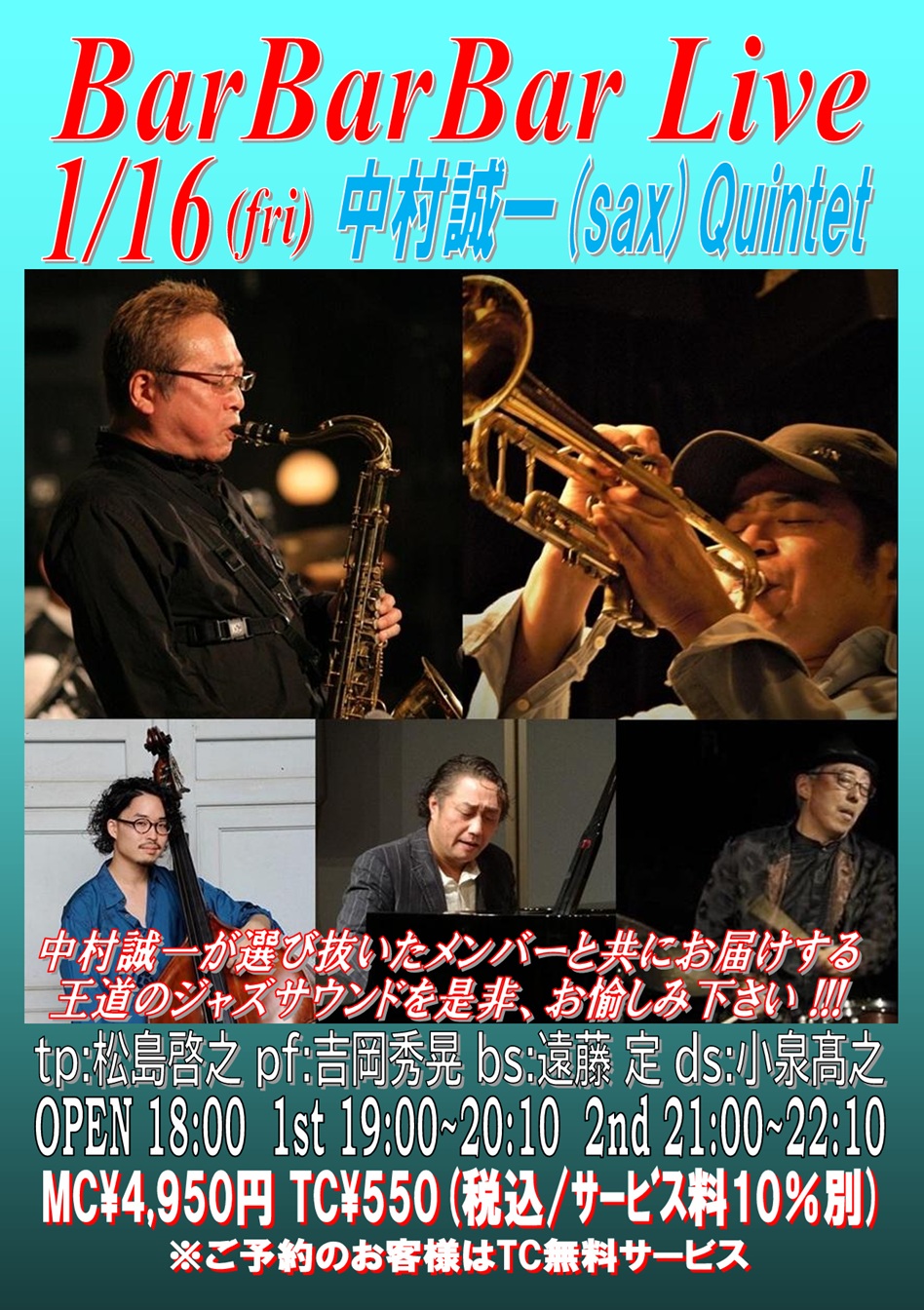 pf:朝倉由里 bs:河原秀夫 ds:小泉髙之 OPEN 18:00 1st 19:00~20:10 (入替なし) 2nd 21:00~22:10 CLOSE 23:00 | 16 ■中村誠一Quintet