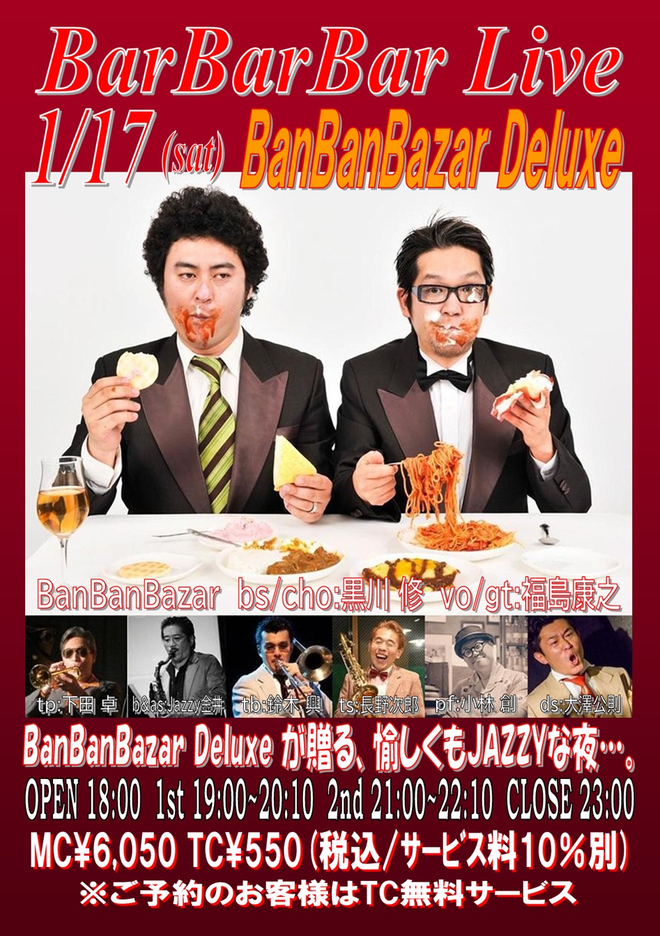 tp:松島啓之 pf:吉岡秀晃 bs:遠藤 定 ds:小泉髙之 OPEN 18:00 1st 19:00~20:10 (入替なし) 2nd 21:00~22:10 CLOSE 23:00 | 17 ※BanBanBazar Deluxe