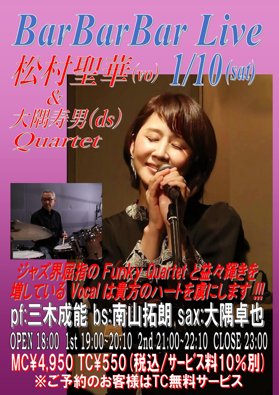 pf:高浜和英 bs:山口雄三 ds:八城邦義 OPEN 18:00 1st 19:00~20:10 (入替なし) 2nd 21:00~22:10 CLOSE 23:00 ※MC 2ステージ通しの場合のみ 6,050円 (税込/サービス料10%別) | 10 ■松村聖華&大隅寿男Quartet