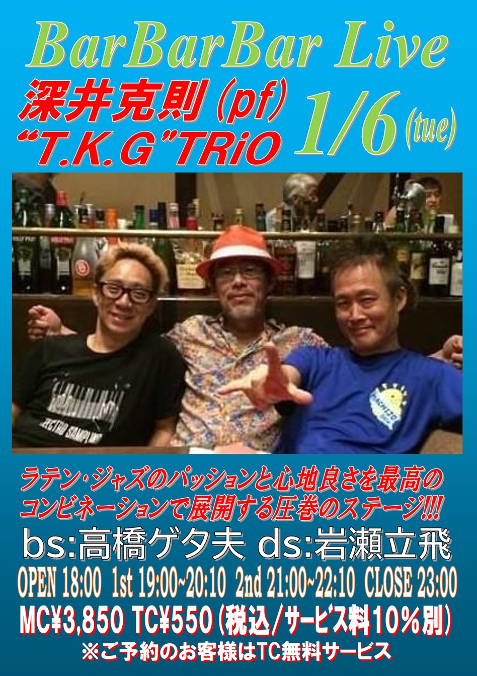 ds:松尾 明 pf:二村希一 bs:新岡 誠 gt:田辺充邦 OPEN 18:00 1st 19:00~20:10 (入替なし) 2nd 21:00~22:10 CLOSE 23:00 | 6 ♣深井克則 T.K.G TRiO