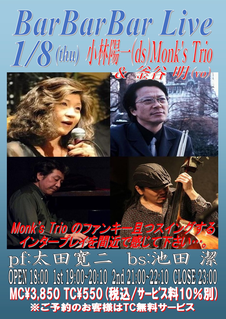 gt:中根一城 bs:古谷 悠 ds:木下晋之介 OPEN 18:00 1st 19:00~20:10 (入替なし) 2nd 21:00~22:10 CLOSE 23:00 | 8 ♣小林陽一Monk's Trio & 釜谷明