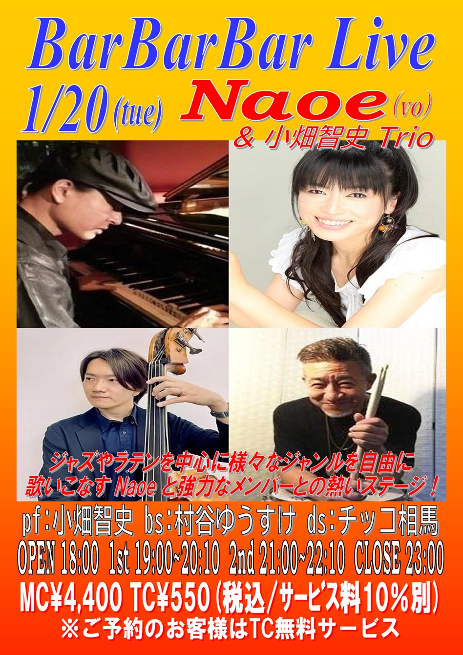 pf:二村希一 bs:ジャンボ小野 ds:ジーン重村 OPEN 18:00 1st 19:00~20:10 (入替なし) 2nd 21:00~22:10 CLOSE 23:00 | 20 ●Naoe & 小畑智史Trio
