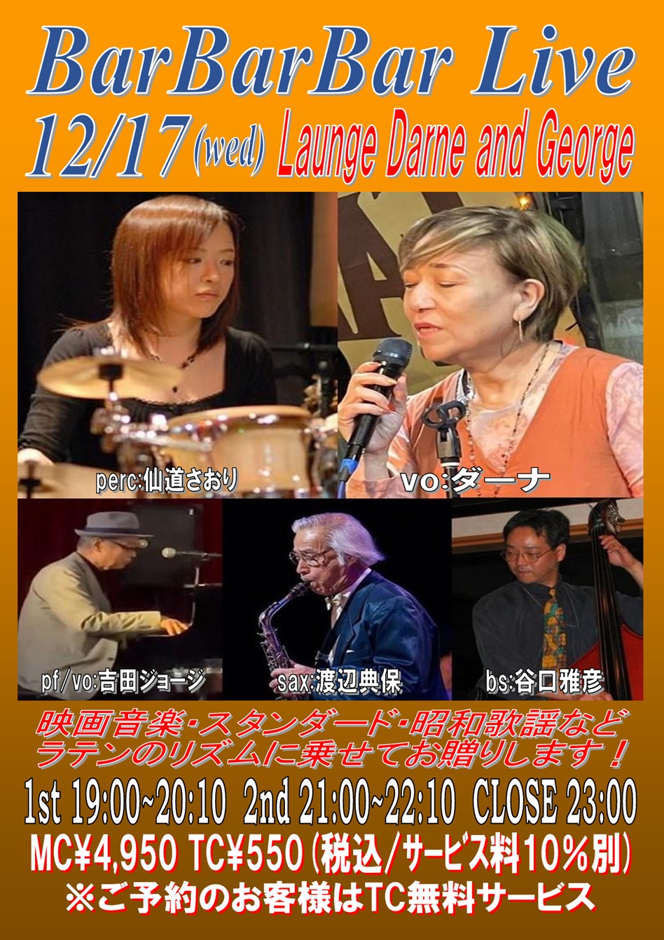 vo:山田夢子 vo:Remi vo:Satsuki sax:中山拓海 fl:笛吹かな r・gt:岸 真澄 pf:青木弘武 bs:竹内秀雄 ds:西川彩織 OPEN 18:00 1st 19:00~20:30 (入替なし) 2nd 21:00~22:30 CLOSE 23:00 MC 6,600円(税込/サービス料10%別) 企画責任者 (一社)神奈川サウンドプロジェクト 池上秀明 | 17 ■Launge Darne and George