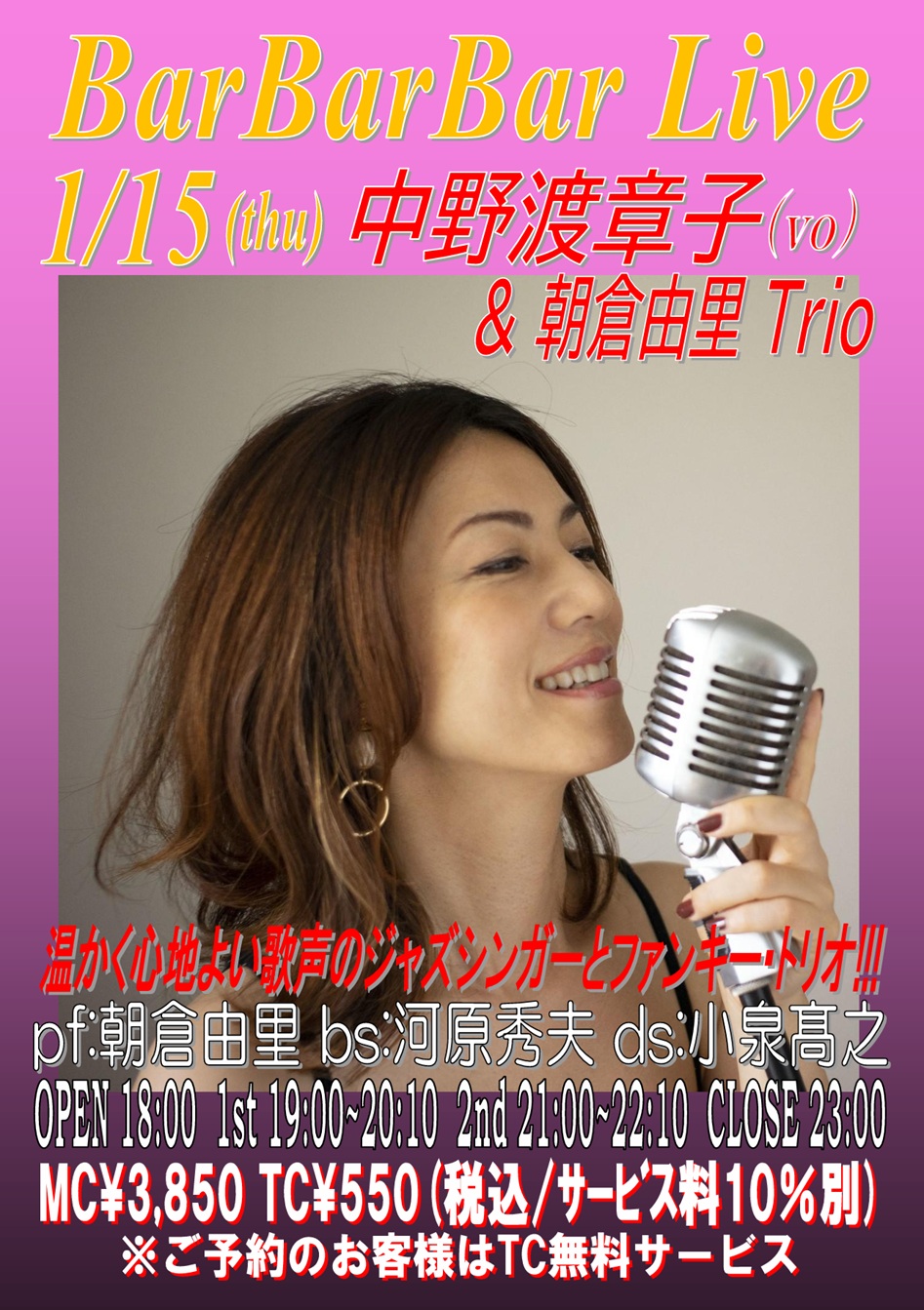 pf:菊地雅之 bs:江上友彦 ds:小林 慎 OPEN 18:00 1st 19:00~20:10 (入替なし) 2nd 21:00~22:10 CLOSE 23:00 | 15 ♣中野渡章子&朝倉由里Trio