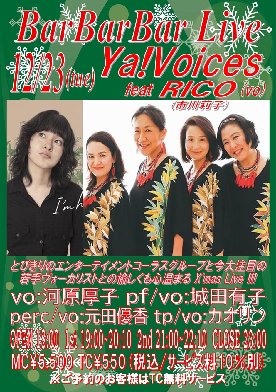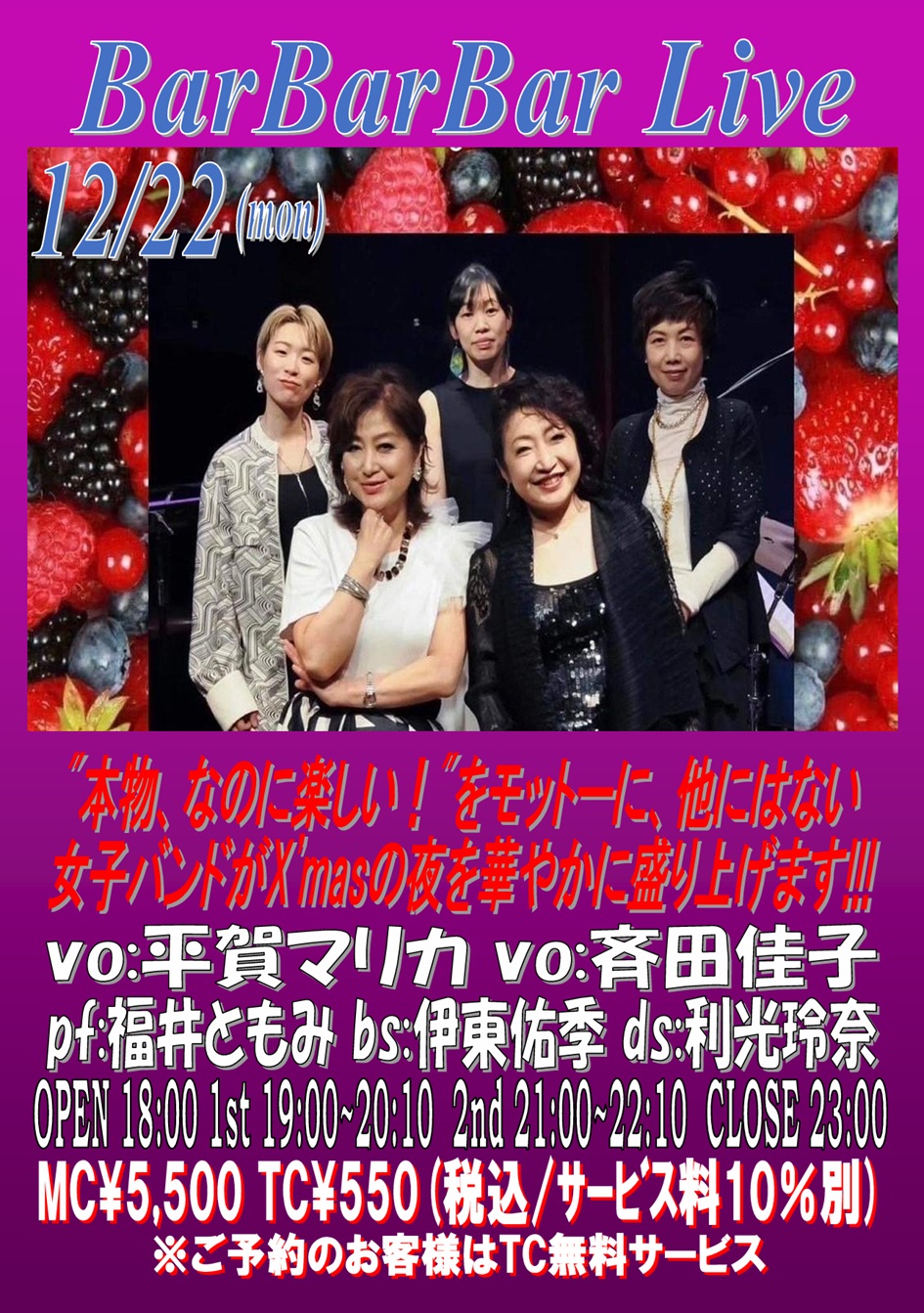vo:河原厚子 pf/vo:城田有子 tp/vo:かおりん perc/vo:元田優香 OPEN 18:00 1st 19:00~20:10 (入替なし) 2nd 21:00~22:10 CLOSE 23:00 | 24 ※寿永アリサ X'mas Special Session