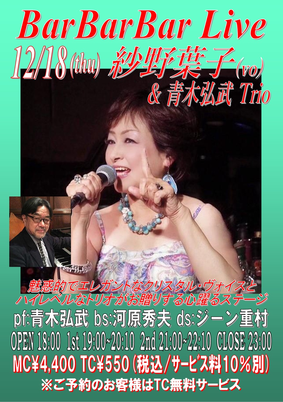 pf/vo:吉田ジョージ bs:谷口雅彦 perc:仙道さおり sax:渡辺典保 OPEN 18:00 1st 19:00~20:10 (入替なし) 2nd 21:00~22:10 CLOSE 23:00 | 18 ●紗野葉子&青木弘武Trio