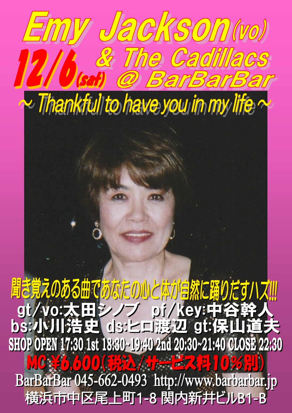 ds:大隅寿男 pf:八木隆幸 bs:永松徳文 sax:大隅卓也 OPEN 18:00 1st 19:00~20:10 (入替なし) 2nd 21:00~22:10 CLOSE 23:00 | 6 ※エミー・ジャクソン & The Cadillacs
