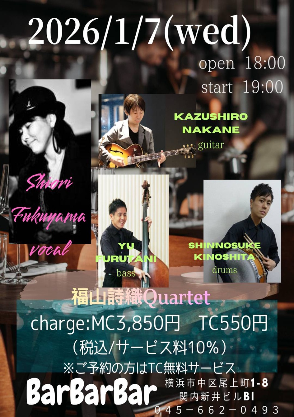 bs:高橋ゲタ夫 ds:岩瀬立飛 OPEN 18:00 1st 19:00~20:10 (入替なし) 2nd 21:00~22:10 CLOSE 23:00 | 7 ♣福山詩織Quartet