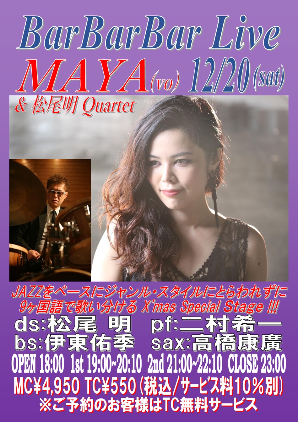 vln:北床宗太郎 pf:川村 健 ds:小山田和正 OPEN 18:00 1st 19:00~20:10 (入替なし) 2nd 21:00~22:10 CLOSE 23:00 | 20 ■MAYA&松尾明Quartet
