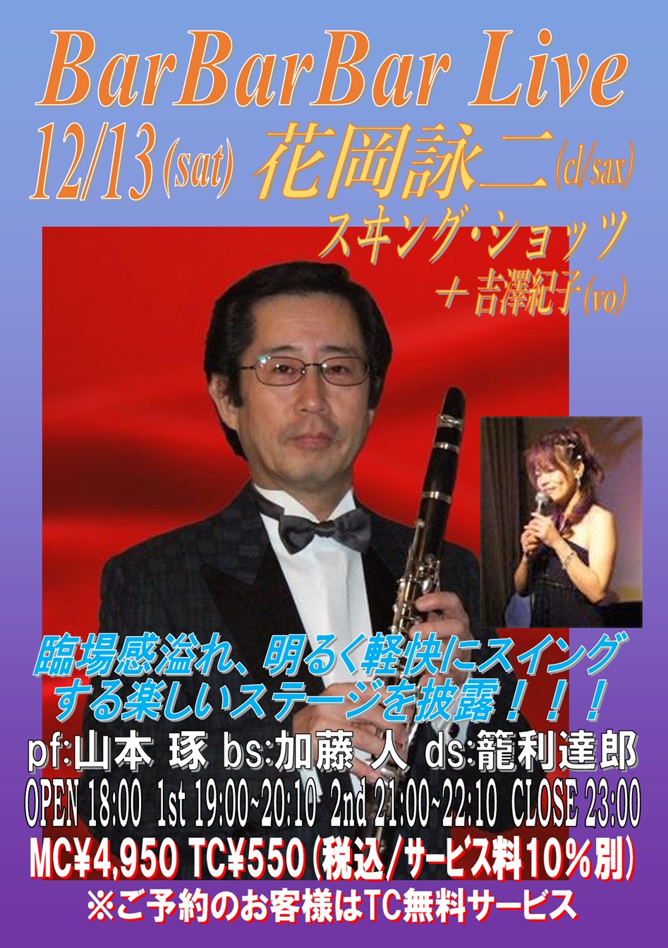 pf:安齋孝秋 bs:江上友彦 ds:中村 誠 sax:河野つつむ OPEN 18:00 1st 19:00~20:10 (入替なし) 2nd 21:00~22:10 CLOSE 23:00 | 13 ■花岡詠二 スヰング・ショッツ