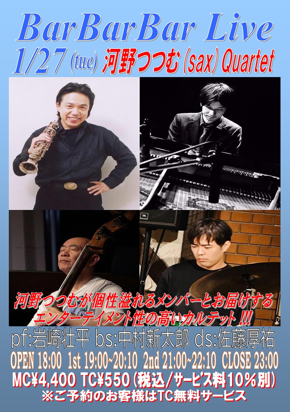 pf:竹内大輔 bs:芹澤薫樹 ds:長谷川ガク OPEN 18:00 1st 19:00~20:10 (入替なし) 2nd 21:00~22:10 CLOSE 23:00 | 27 ●河野つつむQuartet